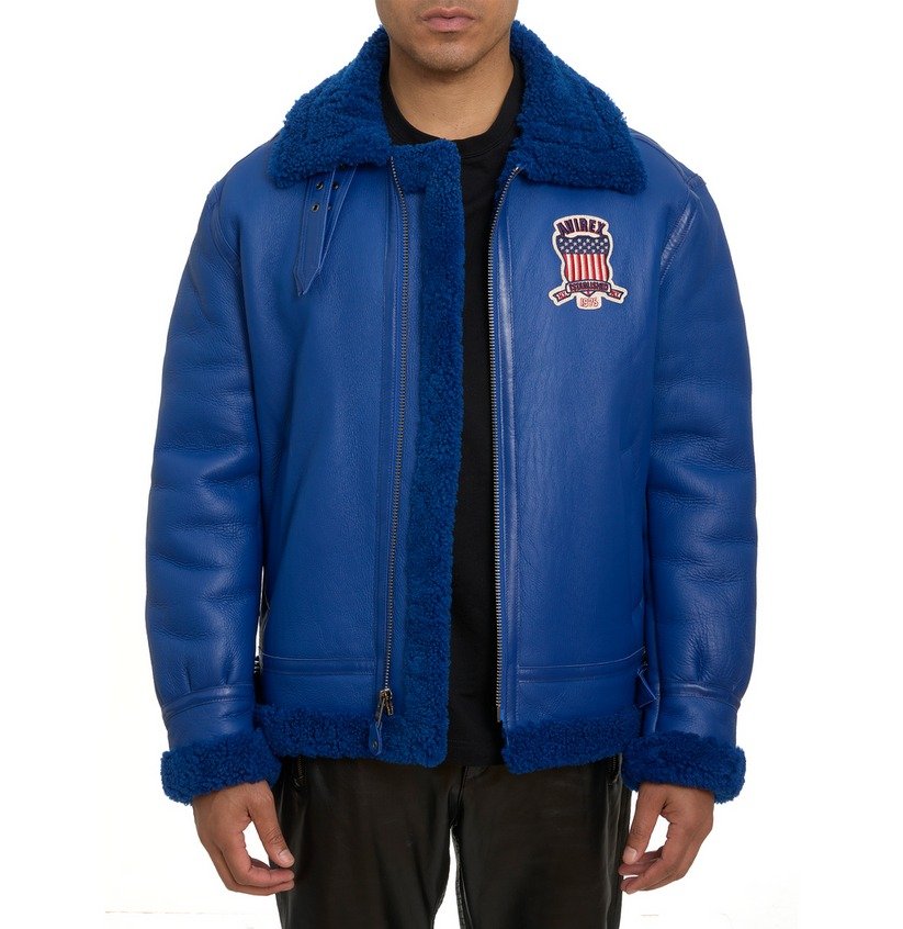 A double-buckle throat latch and adjustable waist belt straps allow for a more custom fit. Shop now and make aviation style with this Avirex B3 Blue Shearling Jacket!