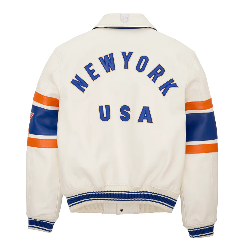 It features New York-inspired embroidered patches, bold stripe accents, and a premium leather build, making it stand out from regular bombers.