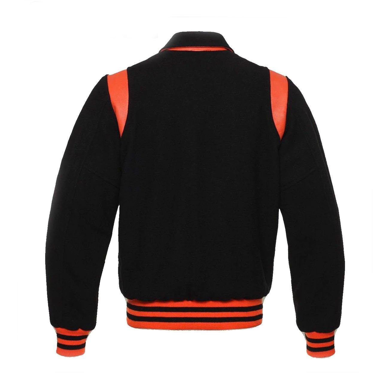 Make a statement with Varsity Jackets This stylish and sophisticated jacket is perfect for everyday looks and special occasions. Featuring a Classic Black Wool Body Combination with Black Leather Sleeves. Black & Orange Ribbing. Orange Leather Swatches on Both Shoulders. Wool & Leather Shirt Collar Varsity Jacket.