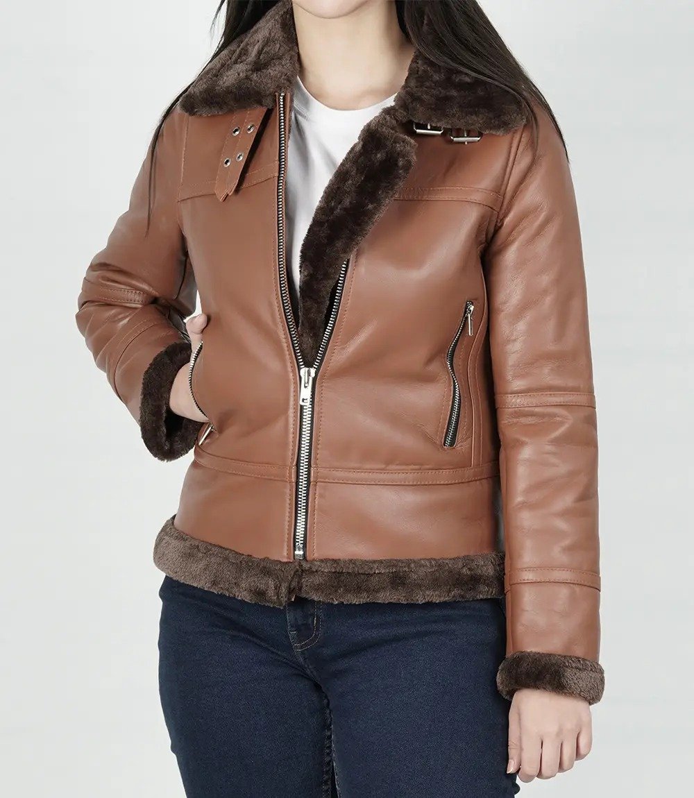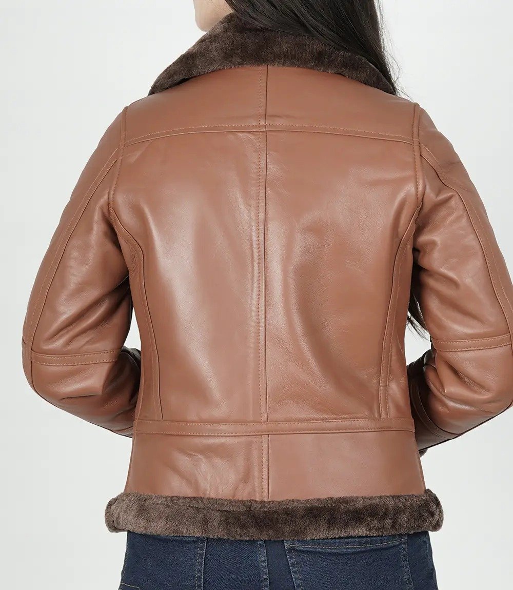 3 reviews for Cognac Shearling Leather Bomber Jacket for Women