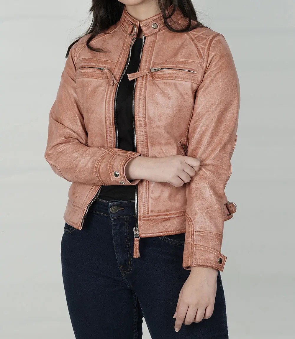 Don’t miss out on the chance to own this elegant yet edgy Women’s Pink Cognac Waxed Cafe Racer Leather Jacket! Available now at MotoCollection, this stylish jacket is designed to elevate your fashion game. Click “Buy Now” to add this luxurious piece to your wardrobe today and experience the perfect blend of elegance and modern flair!