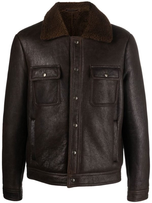 Men Leather Jacket Shearling Collar Sheepskin Real Leather Brown Jacket long Sleeves Buttoned Cuffs