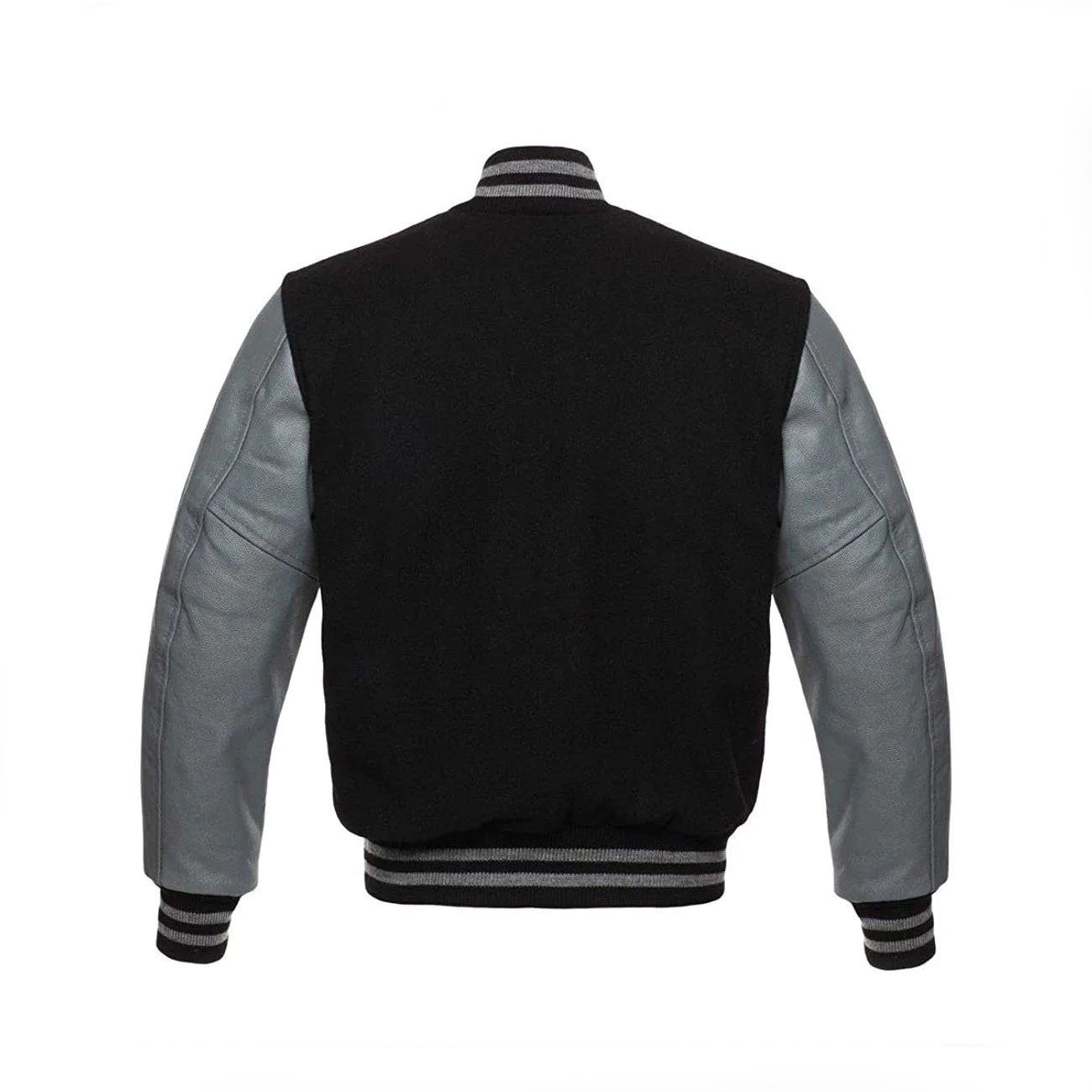 Black Wool With Grey Leather Sleeves Varsity Jacket For Men