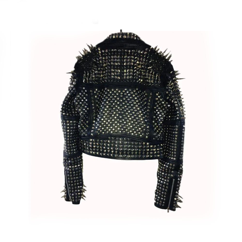 Handmade Women's Black Fashion Golden Studded Punk Style Leather Jacket