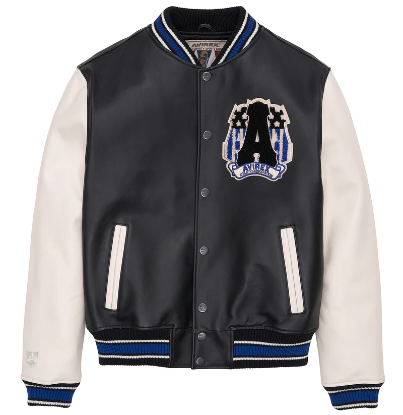 Unleash your inner champion with the Avirex American Varsity Jacket, a perfect blend of classic design and modern flair. Made from premium leather and wool, it delivers durability, warmth, and a sleek modern edge.It’s classic letterman silhouette features signature Avirex detailing, including embroidered patches, chenille lettering, and ribbed trims for a snug fit. The snap-button closure ensures easy wear, while dual side pockets add functionality with style. Whether you’re channelling vintage varsity vibes or elevating your streetwear game, this jacket is a statement piece in every setting. Order now and make your mark with Avirex!