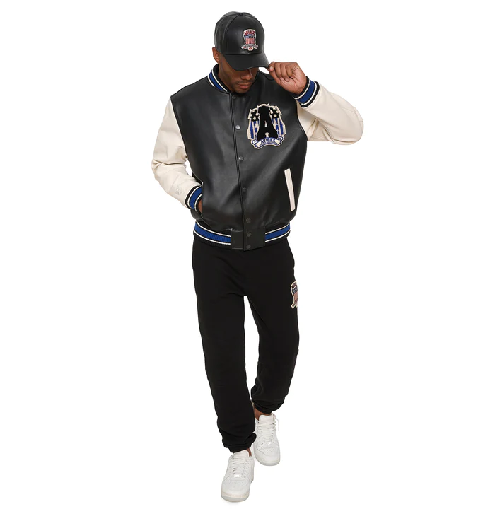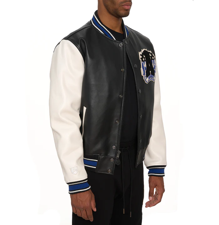 It’s crafted from premium leather and wool, offering durability, warmth, and a stylish varsity look with embroidered patches and chenille lettering for added detail.