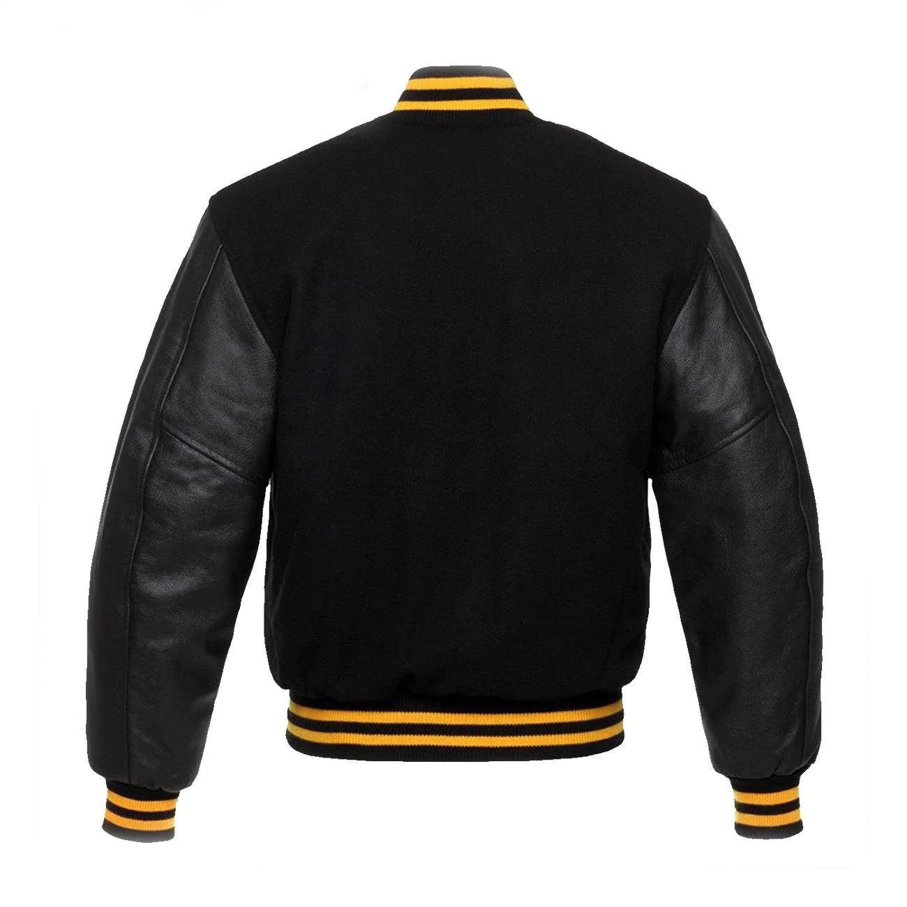 Jet Black Wool Varsity Jacket With Yellow Strips
