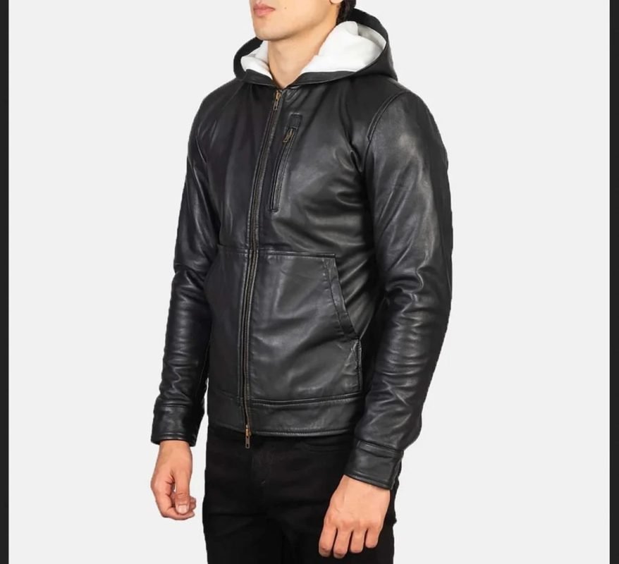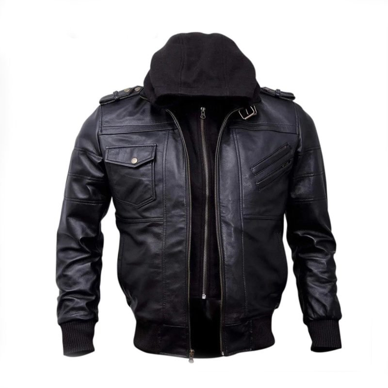 Men’s Genuine Black Hooded Bomber Leather Jacket