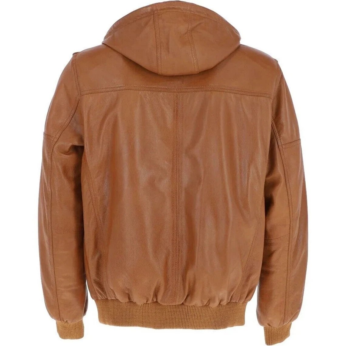 Men’s Biker Bomber Style Tan Real Sheepskin Leather Hoodie Motorcycle Jacket