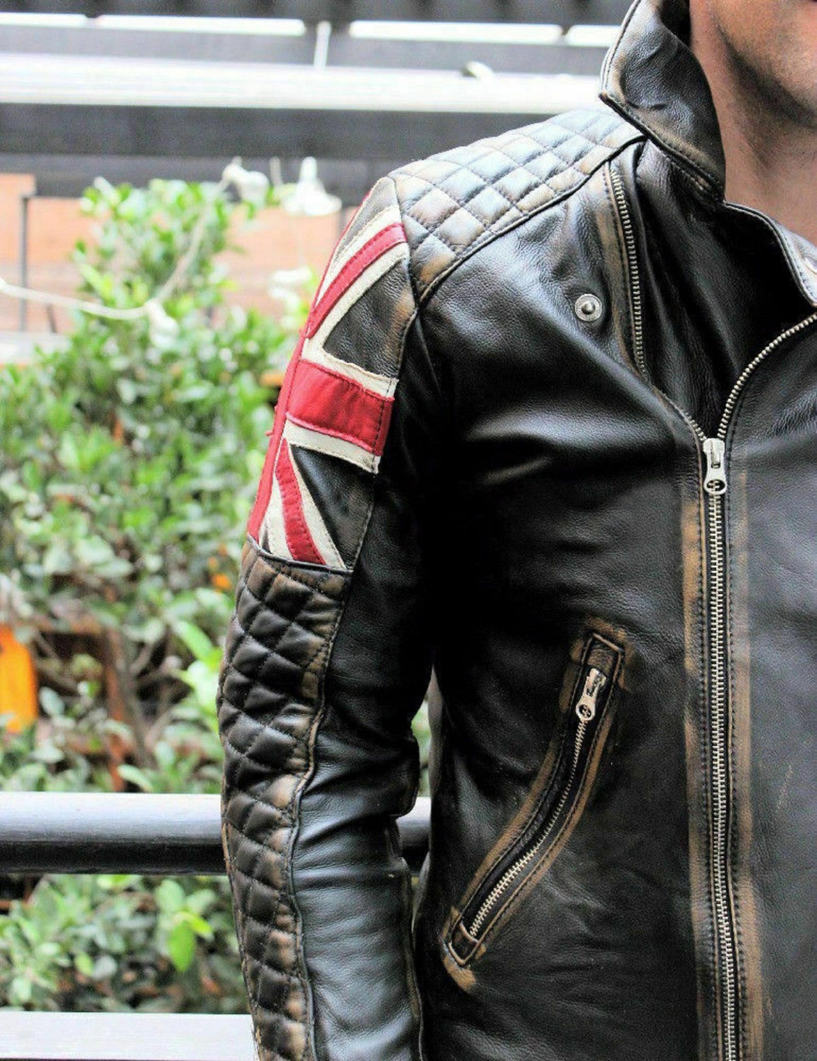MOTERO Men’s UK Flag Double Breast Distressed CE Armoured Biker Leather Jacket