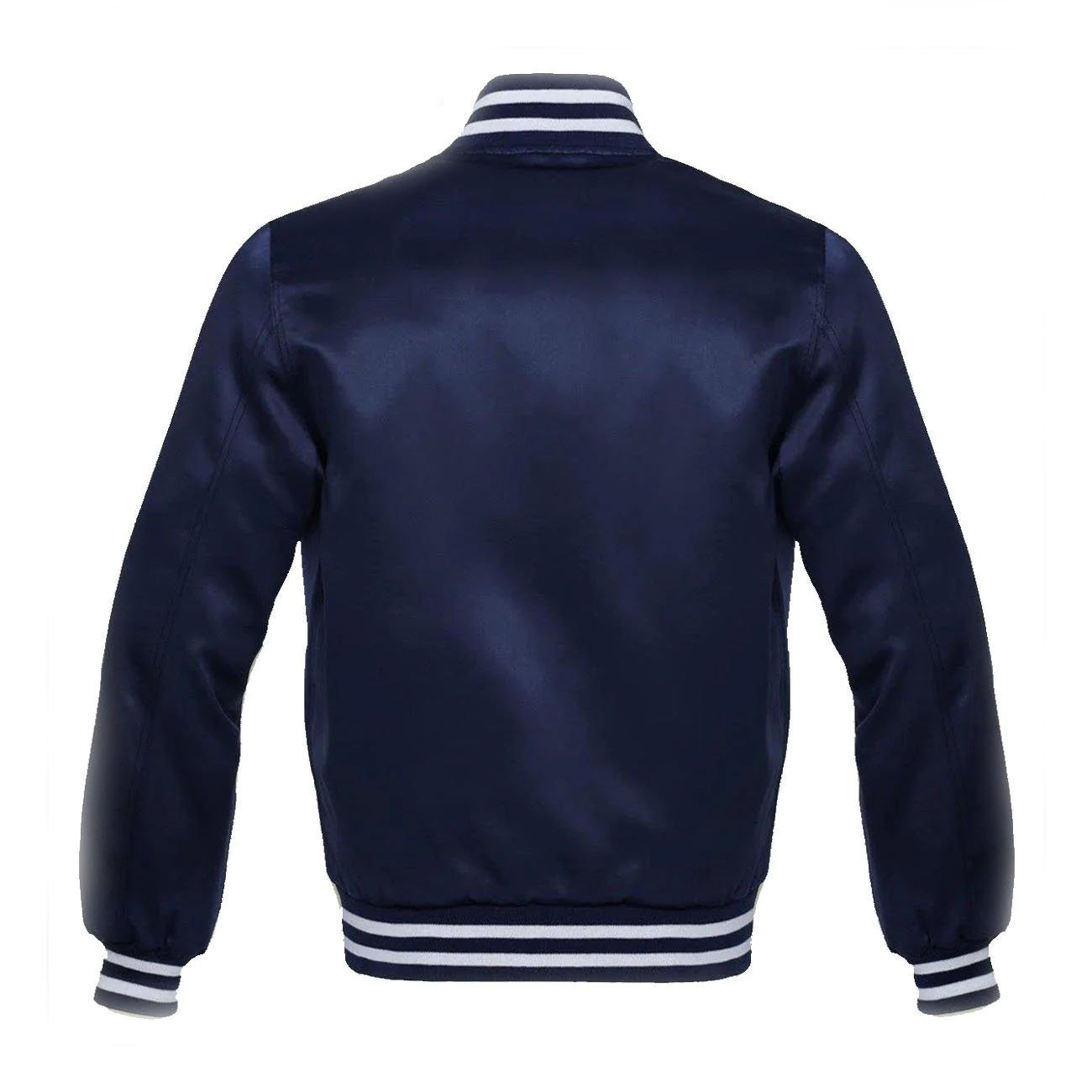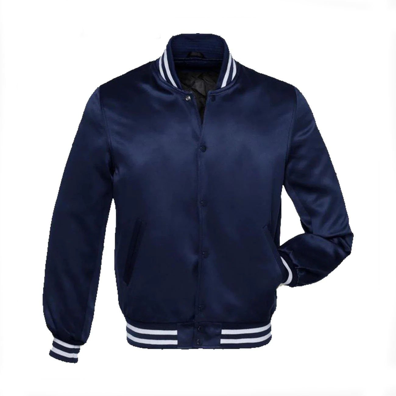 Home » Shop » Leather Jackets » Men » Navy Blue Satin Varsity Jacket with White Stripes