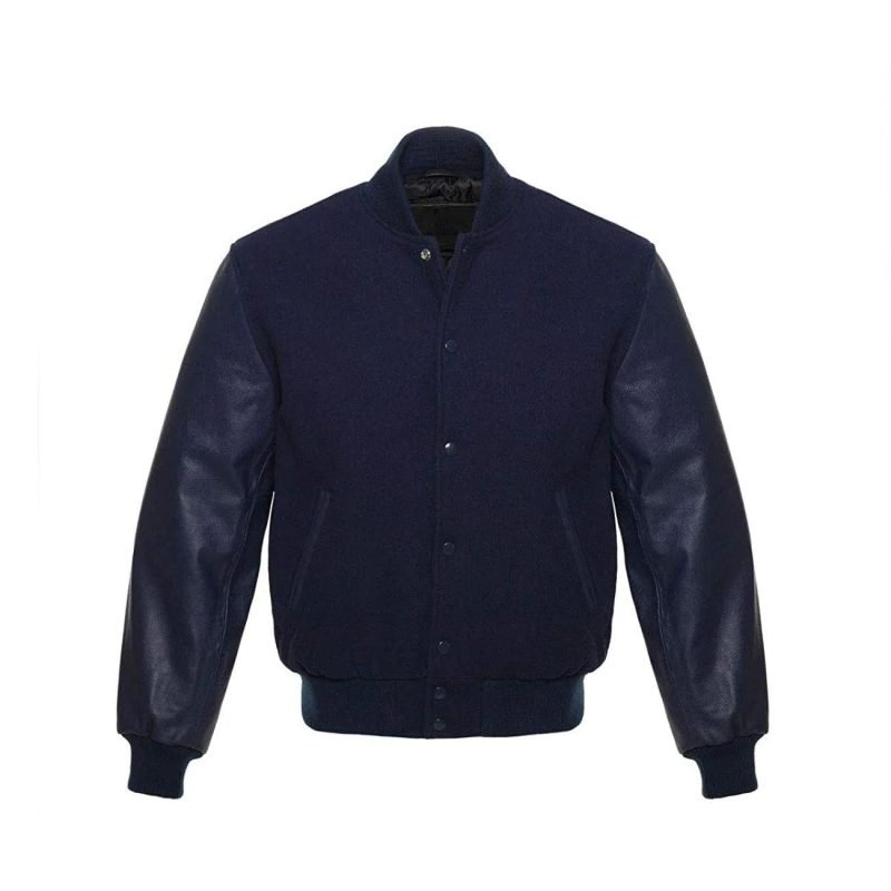 Navy Blue Wool Varsity Jacket With Blue Leather Sleeves