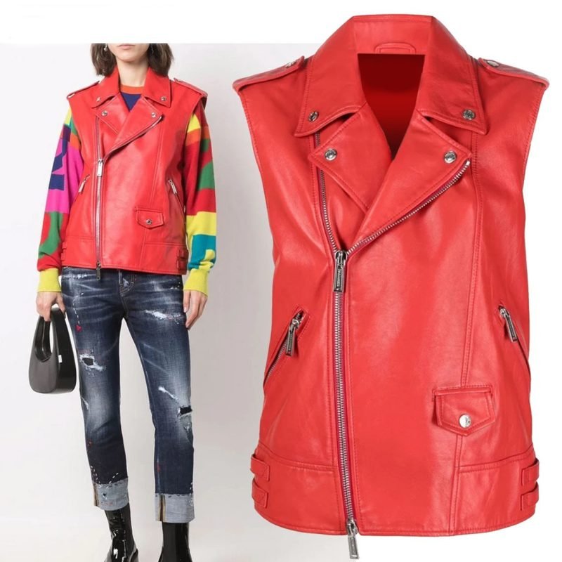 Red Women’s Fashionable Sleeveless Sheepskin Real Motorbike Leather jacket