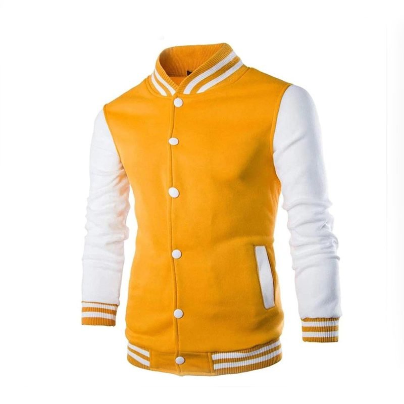 Yellow Wool And White Leather Sleeves Varsity Jacket For Men