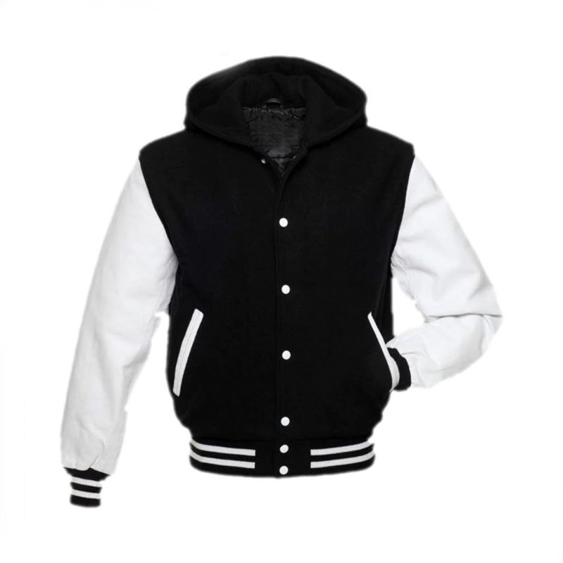 Black Hoodie Varsity Jacket With White Leather Sleeves