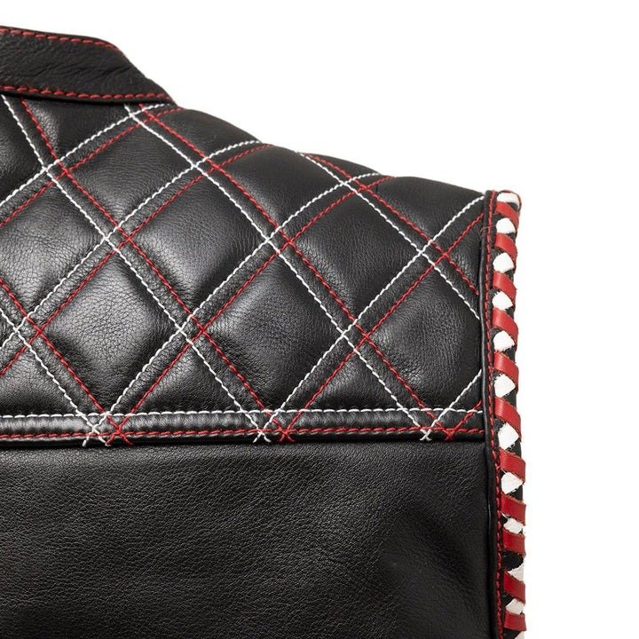 - Stitching: Two rows of double diamond stitches on the shoulders with red piping.