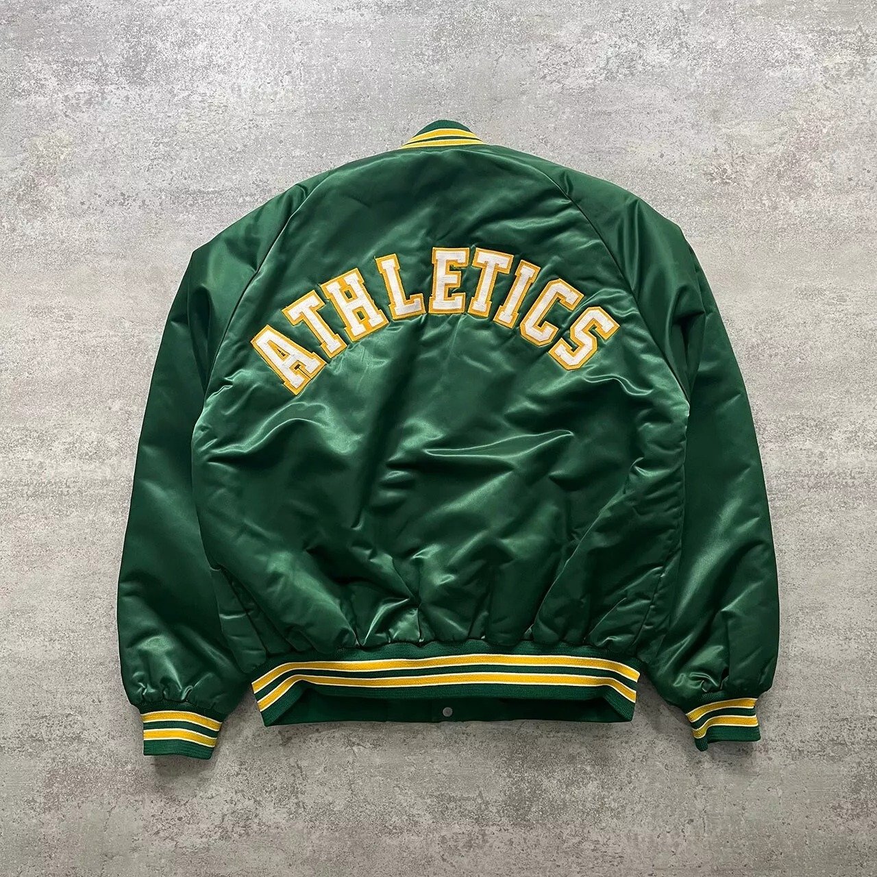 Don’t miss out on owning this piece of MLB history! The Vintage 90s MLB Oakland A’s Chalk Line Green Satin Bomber Jacket is a must-have for any true fan or collector. Visit MotoCollection today and secure your jacket before it’s gone. Show your A’s pride in style limited stock available!