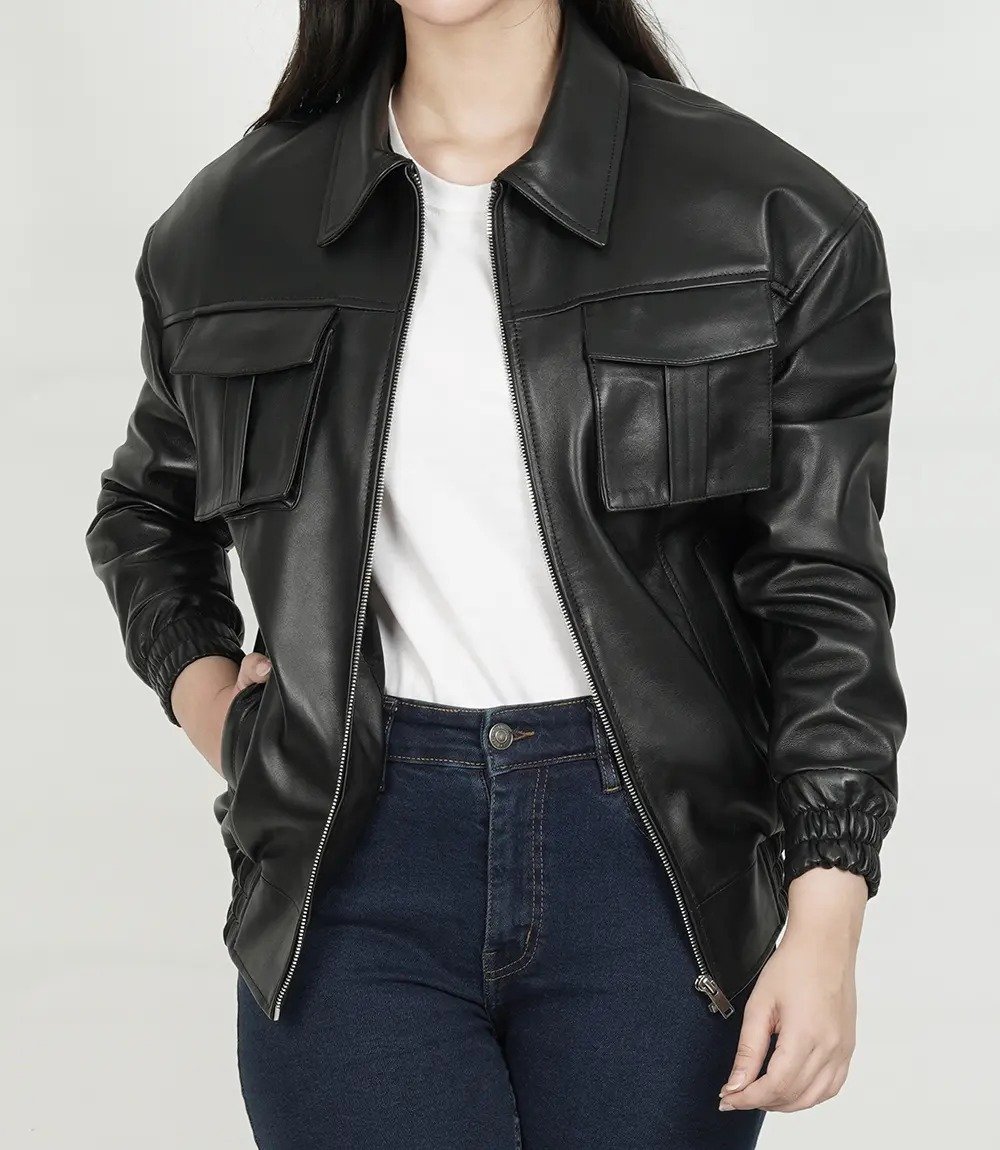 Women’s Black Leather Bomber Jacket in Oversized Style